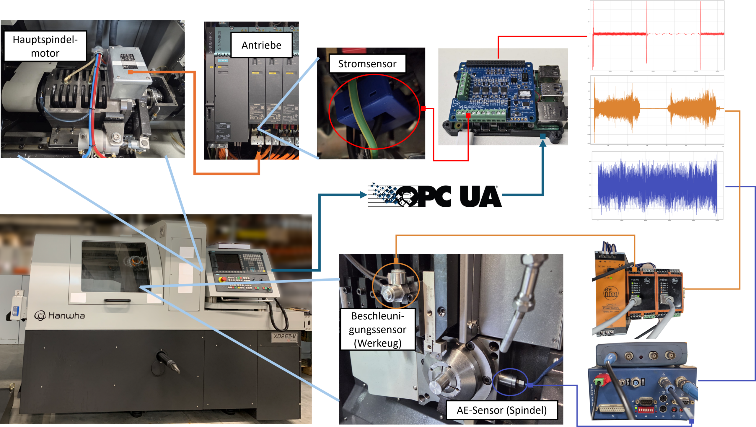 - Aufbau einer multisensorischen Messinfrastruktur auf einer Swiss-Type Drehmaschine zur Erfassung von Strom-, Vibrations- und Acoustic-Emission-Signalen während der Bearbeitung.